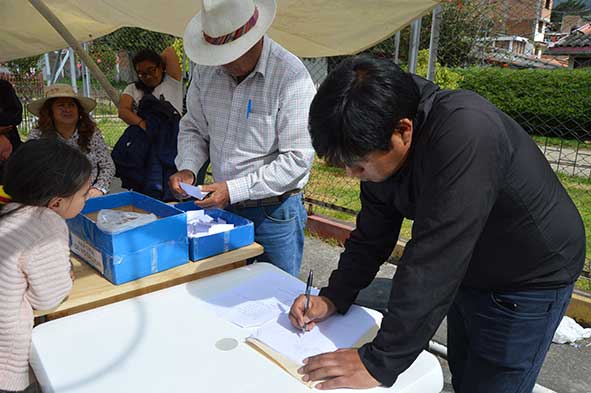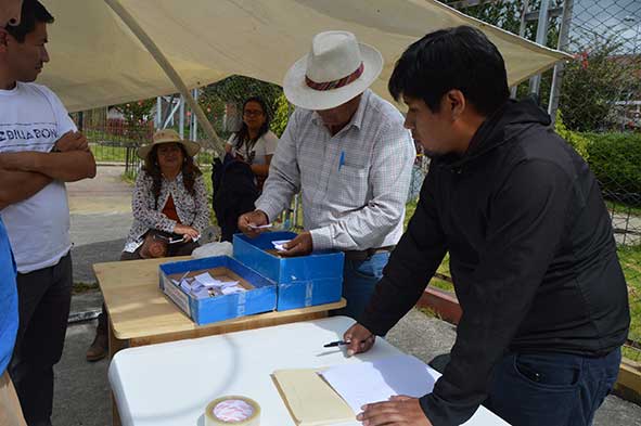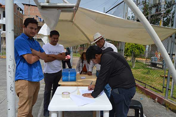 Como las cantidades coincidían se prosiguió con el escrutinio, el Sr. Alindor Vigo, secretario del Comité electoral sacaba de uno en uno los votos del ánfora y leía el número de lista que marcaba el voto, el Ing. Alán Boñón, Presidente del Comité electoral, tabulaba los votos leídos: