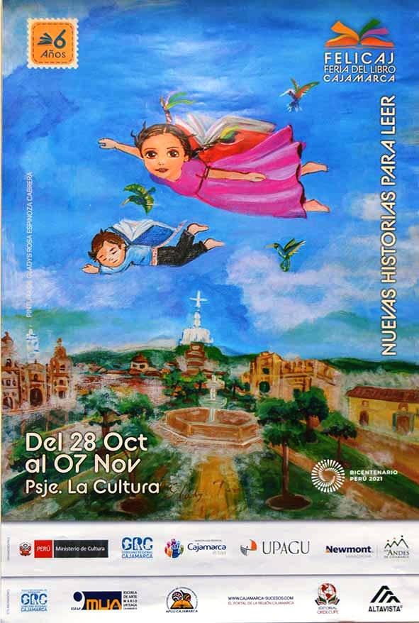 “La lectura nos traslada mágicamente a cualquier espacio del mundo, del tiempo y hasta a lugares inimaginables”, menciona Gladis Espinoza, artista plástica que ilustró el afiche oficial de la Feria del Libro Cajamarca, cuya presentación marcó el inicio de las actividades de esta sexta edición denominada Felicaj Bicentenario.