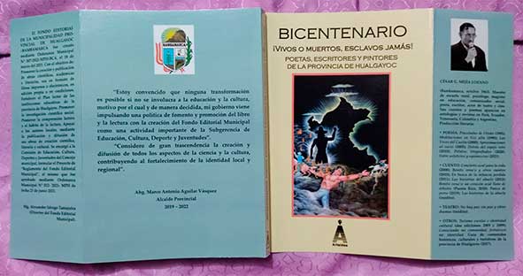MEJÍA LOZANO, César. Bicentenario. ¡Vivos o muertos, esclavos jamás! Poetas, Escritores y Pintores de la provincia de Hualgayoc. Mayo, 2022. © César Mejía Lozano, © Municipalidad Provincial de Bambamarca, © Grupo Editorial Arteidea Perú EIRL. Impresión: Imprenta Kartergraf S.R.L Lima, Perú. 228 pág. 14.7 x 20.8 cm. |