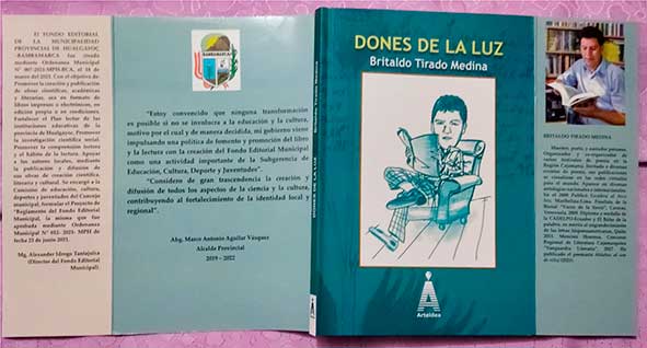 Dones de la Luz de Britaldo Tirado Medina, es un libro de poesía que incrementa el caudal poético de Bambamarca, luego de publicar Escalera al Arco Iris, ediciones Maribelina, 2008; Aldabas al son del reloj, 2021, nos alcanza Dones de la Luz un poemario Que agrupa a los poemas en cinco partes: Dones del poeta, con 40 poemas; Don del paraíso, 28 poemas; Dones de la luz, 18 poemas; Matices del don, 26 poemas; y, Don de las intenciones, 28 poemas; que hacen un total de 140 poemas con versos muy bien logrados.