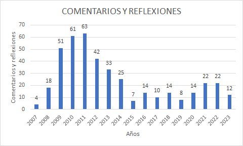 - En Quinto lugar, se ubica Comentarios y Reflexiones fue creada el 14 de junio 2007, tiene acumulados 420 artículos en la siguiente distribución: TABLA N° 3
