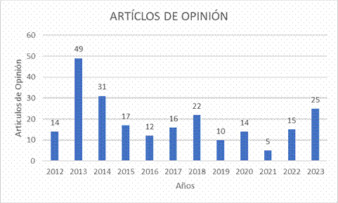 - Sigue en Quinto lugar la sección Artículos de opinión, creada el 29 de octubre 2012 con 230 artículos publicados distribuidos de la siguiente manera: TABLA N° 2
