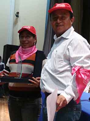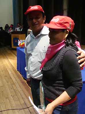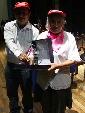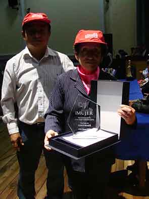 La Sra. María Elena Cusquisiván: Mujer emprendedora, recibe su condecoración por un representante del Gobierno Local. |