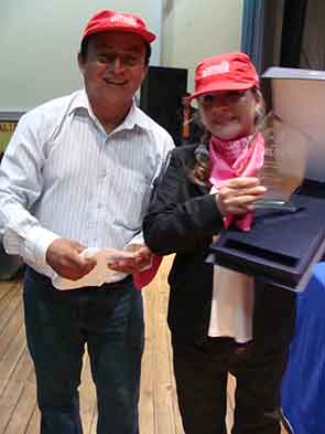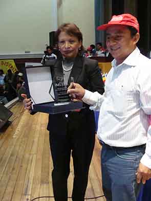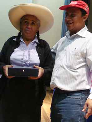 La Sra. María Jara Aquino: Mujer rural, recibe su condecoración por un representante del Gobierno Local. |