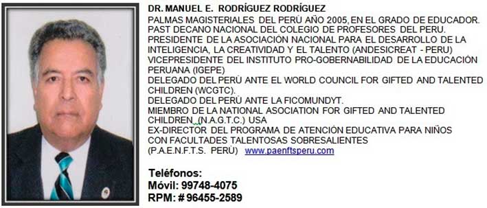 Presidente de la Asociación Nacional para el Desarrollo de la inteligencia la Creatividad y el Talento. (ANDESICREAT-PERÚ)