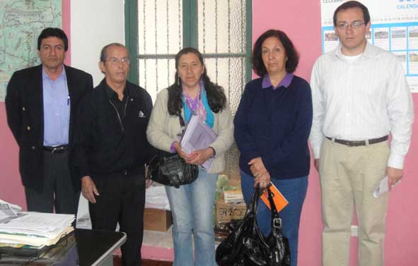 Ing. Julio Palacios Matute, Sr. Guillermo Bazán Becerra, Sra. Socorro Barrantes Zurita, Sra. Sara Gutiérrez Sisniegas y Dr. Gary Cáceres Centurión en una Sesión de Coordinación en INC