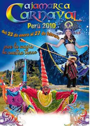 En Conferencia de Prensa presidida por la Presidenta del Patronato del Carnaval 2010 la Sra. Kori Lezama Llaque, el Presidente de los Comités de Barrios Sr. William Araujo, delegados de las empresas auspiciadoras y representantes de la prensa cajamarquina, que se llevó a cabo ayer por la mañana en el patio principal de la sede de la Municipalidad Provincial de Cajamarca (MPC) se hizo la presentación Oficial del “Afiche del Carnaval de Cajamarca 2010”, del "Programa del Carnaval 2010" y de un Website con información exclusiva. Como recordaremos, la autoría de esta obra de arte le corresponde al artista y diseñador gráfico cajamarquino Ronald Tarrillo Santa Cruz cuyo trabajo se hizo merecedor al Primer Puesto del concurso por manifestar la esencia de la fiesta más popular de Cajamarca, reflejar nuestra identidad cultural cajamarquina y representar las dos maravillas del Perú Baños del Inca y Cumbe Mayo. |