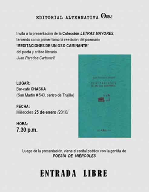 Editorial Alternativa OREM invita, dentro del marco de los recitales denominados ‘Poesía de Miércoles’ (organizados por Infolectura), a la presentación de la Colección LETRAS MAYORES, iniciando con la reedición del poemario ‘Meditaciones de un oso caminante’ del poeta y crítico literario Juan Paredes Carbonell.