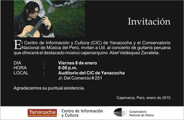 El día de hoy viernes 08 de Enero, el destacado músico cajamarquino Abel Velásquez Zavaleta estará ofreciendo a toda la colectividad cajamarquina un estupendo Concierto De Guitarra Peruana este interesante suceso artístico está organizado por el CIC de Yanacocha y el Conservatorio Nacional de Música del Perú. El Evento tendrá lugar en el auditorio del CIC de Yanacocha, sito en el Jr. Del Comercio Nº 251, desde las 08:00 p.m.