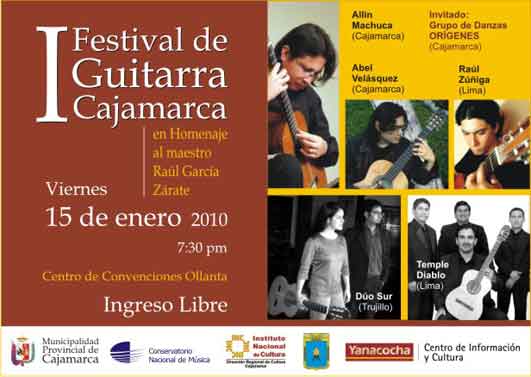 El viernes 15 de Enero del 2010, a las 07:30 de la noche en el Centro de Convenciones “Ollanta” de la Universidad Nacional de Cajamarca se estará llevando a cabo el I Festival de Guitarra Cajamarca como homenaje al gran maestro nacional Raúl García Zárate que le tributan un selecto grupo integrado por docentes y alumnos cajamarquinos del Conversatorio Nacional de Música en coordinación con el CIC de Yanacocha, La Universidad Nacional de Cajamarca y el Instituto Nacional de Cultura.
