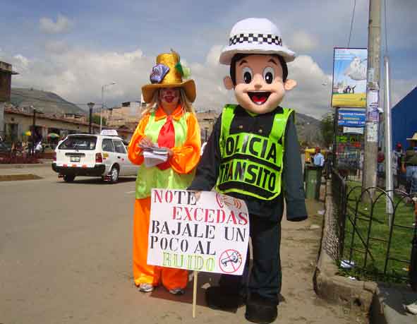 La Municipalidad Provincial de Cajamarca (MPC) y la Policía Nacional del Perú (PNP) han organizado la I Jornada de Sensibilización para reducir el impacto de la contaminación sonora, con la finalidad de controlar la contaminación sonora producida por ultrasonido, ruido y vibración, en la vía pública, salas de espectáculos, eventos de reuniones, casas, locales de diversión, comercio de todo género, iglesias y casas religiosas. Esta jornada de sensibilización se realizará por el lapso de una semana en lugares estratégicos de la ciudad exhibiendo carteles alusivos a la actividad y con personal disfrazado de ambas instituciones, como se aprecia en la fotografía que les mostramos.