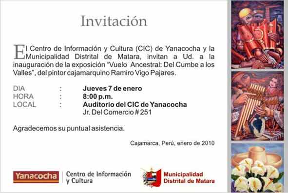 Iniciando las actividades culturales del 2010, el día jueves 07 de Enero, a las 08:00 p.m. en el auditorio del Centro de Información y Cultura Yanacocha (CIC) se desarrolla la ceremonia inaugural de la muestra de pintura Vuelo Ancestral: Del Cumbe a los Valles del pintor cajamarquino Ramiro Vigo Pajares.