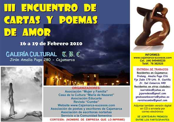 Por tercer año consecutivo se desarrolla el “Encuentro de Cartas y Poemas de Amor”, dedicado al Día de San Valentín o Día del amor, gracias al entusiasmo de un grupo de instituciones cajamarquinas que organizan, auspician y desarrollan un evento literario-musical, con la participación de los poetas y escritores de la Región Cajamarca que leen sus cartas o declaman sus poemas que han escrito para esta especial ocasión, poniendo de manifiesto su creatividad, sensibilidad y amor a su ser querido…