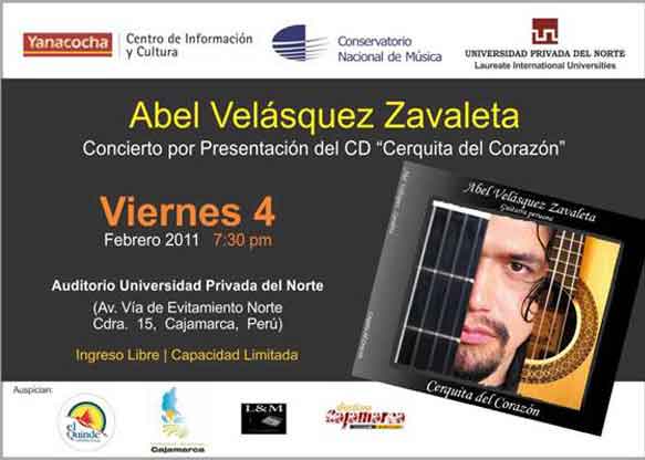 Cumpliendo con la programación de actividades culturales “Cajamarca Cultural” realizada por el CIC de Yanacocha, el viernes 04 de febrero el músico cajamarquino Abel Velásquez Zavaleta ofrecerá a la colectividad cajamarquina un concierto por presentación de su CD “Cerquita del Corazón” desde las 07:30 p.m. en el Auditorio de la Universidad Privada del Norte UPN sito en la Cda. 15 de la Av. Vía de Evitamiento Norte, de Cajamarca, Perú, con ingreso libre.