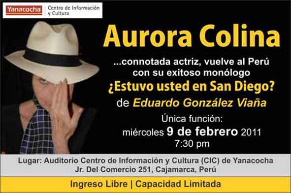El día 09 de febrero, la actriz Aurora Colina, presentará su exitoso monólogo ¿Estuvo usted en San Diego? de Eduardo González Viaña en el Auditorio del CIC de Yanacocha desde las 07:30 de la noche con ingreso libre.