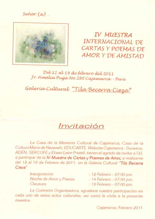 El día de hoy 12 de febrero del 2011, se llevará a cabo la "Ceremonia inaugural" de la "IV Muestra Internacional de Cartas y Poemas de Amor y de Amistad", el escenario, nuevamente la Casa Cultural "Tila Becerra Cieza" ubicado en el Jr. Amalia Puga Nº 280 de la ciudad de Cajamarca, Perú con ingreso libre desde las 07:00 p.m..