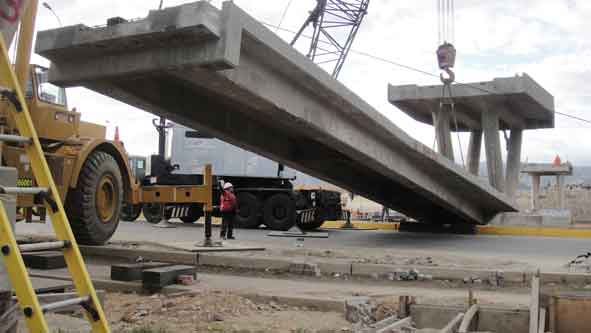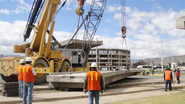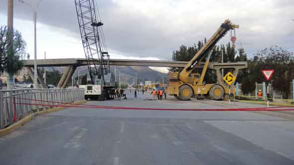 Ante un grupo considerable de curiosos apreciamos el manipuleo, levantamiento o isaje y colocación de las lozas armadas de más de 80 toneladas de peso por dos gigantescas grúas proporcionadas por la Minera Yanacocha en los muros estructurales con columnas armadas de soporte del puente.