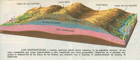 Cuando el agua cae sobre rocas permeables se infiltra a través de ellas hasta alcanzar el manto acuífero. Las aguas del manto se mueven en las mismas direcciones de las aguas superficiales, pues, el nivel hidrostático sigue, aproximadamente, los caracteres del relieve.