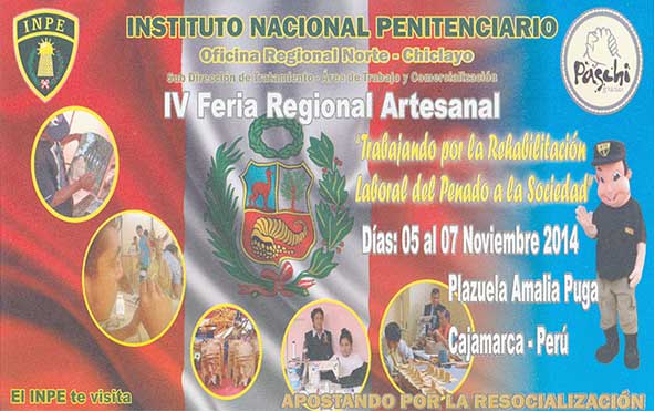 Del 05 al 07 de noviembre se está llevando a cabo la IV Feria Regional Artesanal en la Plazuela Amalia Puga de Losada de la ciudad de Cajamarca con la participación de los Centros Penitenciarios de Cajamarca, Chiclayo, Jaén, Piura, Sullana, Trujillo Mujeres y Trujillo Varones, ofertando en exposición y venta de artículos de artesanía construidos por los internos de los Centro Penitenciarios participantes.