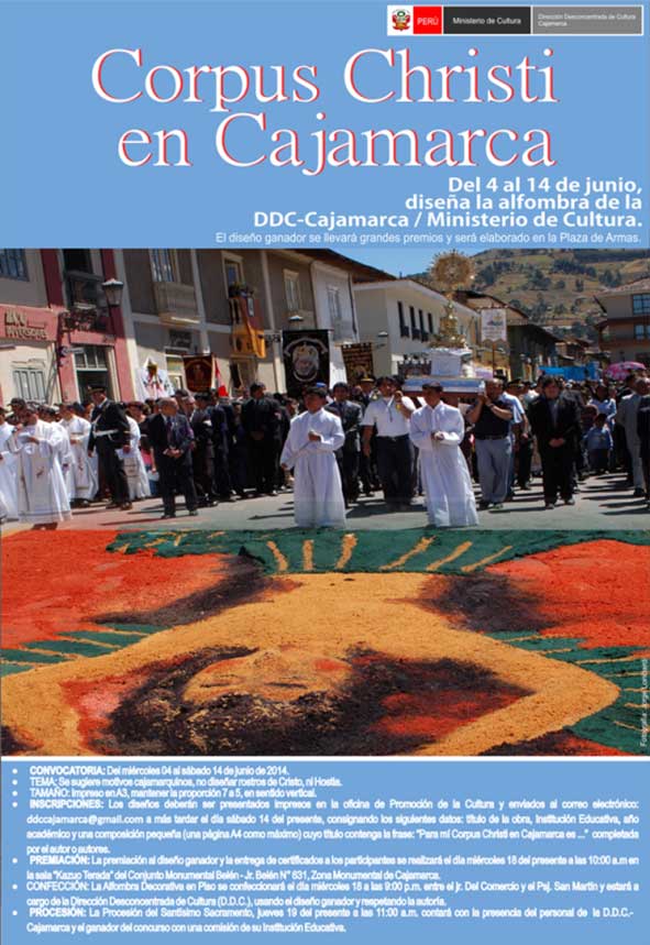 · Inscripciones: Los diseños deberán ser presentados impresos en la oficina de Promoción de la Cultura y enviados al correo electrónico: ddccajamarca@gmail.com a más tardar el día sábado 14 del presente, consignando los siguientes datos: título de la obra, Institución Educativa, año académico y una composición pequeña (una página A4 como máximo) cuyo título contenga la frase: “Para mí Corpus Christi en Cajamarca es ...” completada por el autor o autores.
