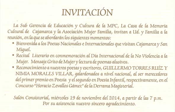 Los organizadores y los autores de estos libros invitan muy cordialmente a la colectividad cajamarquina a esta ceremonia de presentación.