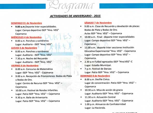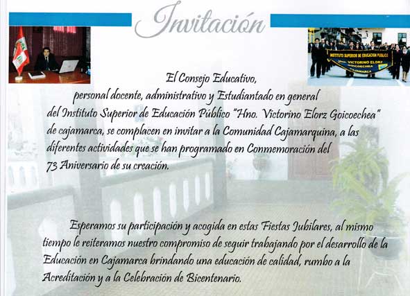 Con un nutrido programa el Instituto Superior de Educación Público “Hno. Victorino Elorz Goicoechea” – ISEP “Hno. VEG” de Cajamarca celebra el 73° Aniversario de creación, algunas actividades son de justo y merecido homenaje a docentes de esa Alma Mater que han partido al Reino del Señor pero su recuerdo, su dedicación y su obra quedará incólume en el recuerdo de sus alumnos, docentes, familiares y de Cajamarca, así tenemos el II Encuentro de Poetas y Escritores Victorinos de Poncho y Sombrero “Ebert Paisig Cotrina” lleva el nombre muy merecido del dinámico Prof. Ebert Paisig, La Noche del Recuerdo está dedicada a otro excelente y dinámico Prof. Carlos Cotrina...
