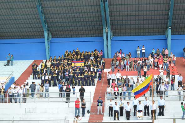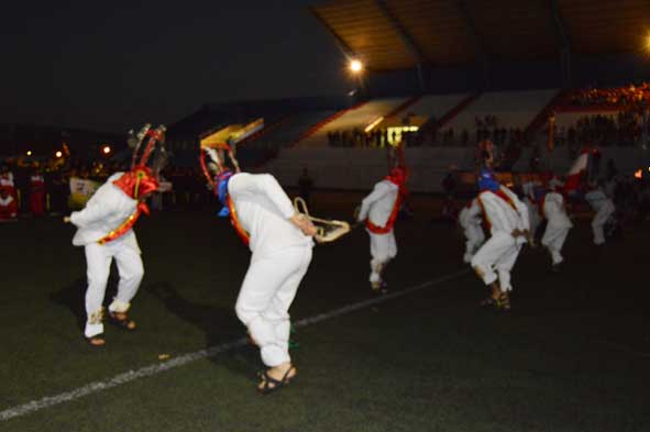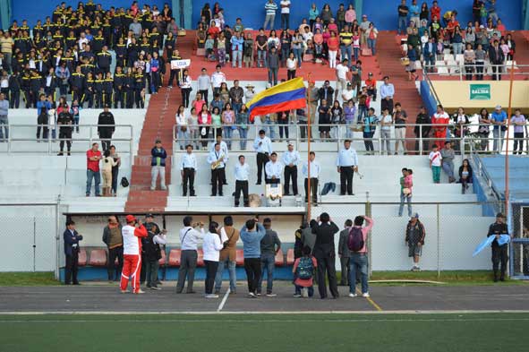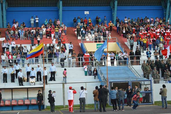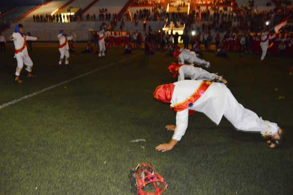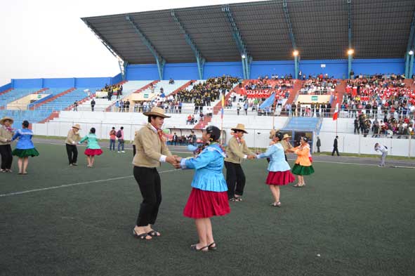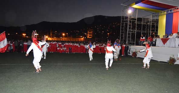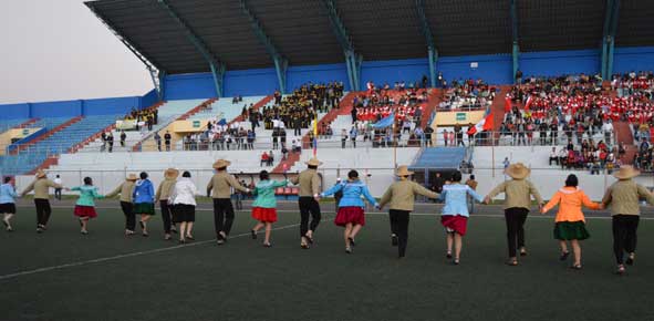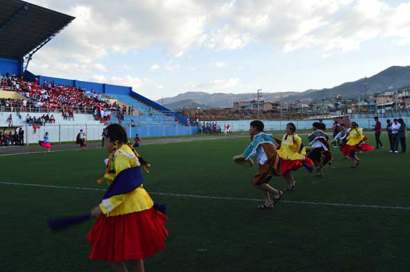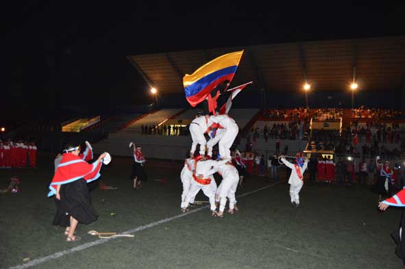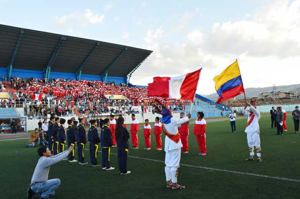 La ceremonia finalizó con lanzamiento de bombardas y baile de confraternidad deportiva para las delegaciones de Perú y Ecuador en el gramado del Estadio Héroes de San Ramón.