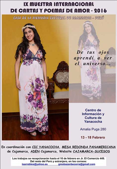 Como los años anteriores, la CASA DE LA MEMORIA CULTURAL DE CAJAMARCA - Perú, se honra en invitarte a participar en la IX Muestra internacional de cartas y poemas de amor, que realizaremos del 13 al 18 de febrero próximo, en la Galería del Centro de Información y Cultura Yanacocha, ubicada en el Jirón Amalia Puga 280 - Cajamarca.
