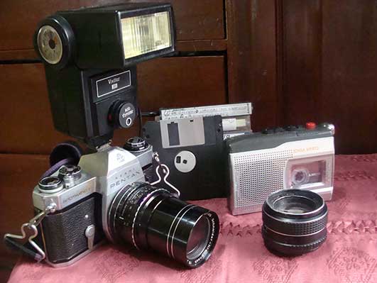 Y, yo, con mi paso ya cansino y la nieve que cubre mis cabellos, guardo como uno de mis mejores tesoros aquella época de febril quehacer periodístico. Y, mirando a mi vieja y amada PENTAX, la consuelo diciéndole muy quedito: compañera silenciosa de aquella días ¡Te amo de veras y por más que te miren de soslayo las modernas maquinitas de última generación ¡Jamás te enviaré a un museo para que duermas el eterno sueño y te lancen miradas burlonas !Hasta el último minuto de mi existencia- que ya no está lejano- te arroparé con mis arrullos, acariciando tu oscura piel y en secreto diálogo recordaremos nuestras sudorosas caminatas y hasta los tremendos golpes que te diste por seguir nuestros alocados pasos. A tu lado están los viejos casettes que registraron las entrevistas hechas a personajes de aquella época, muchos de ellos ya ausentes para siempre.
