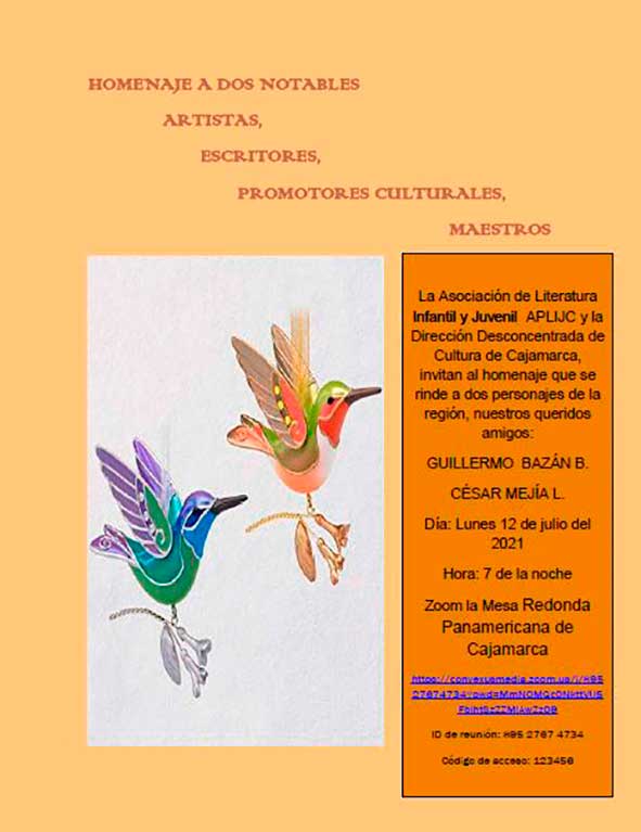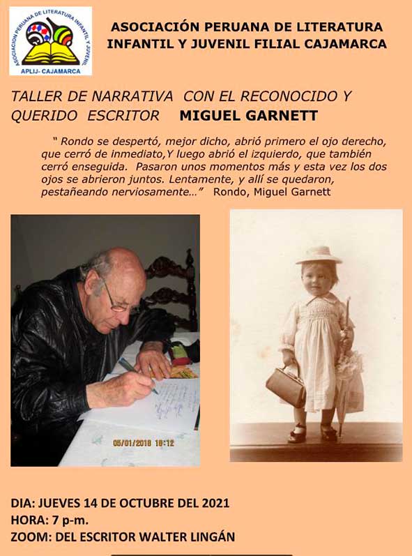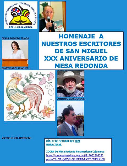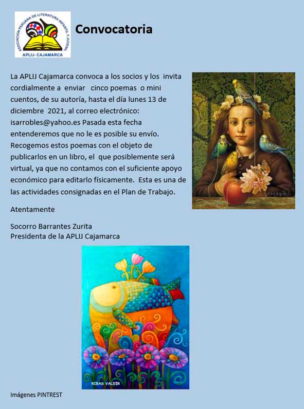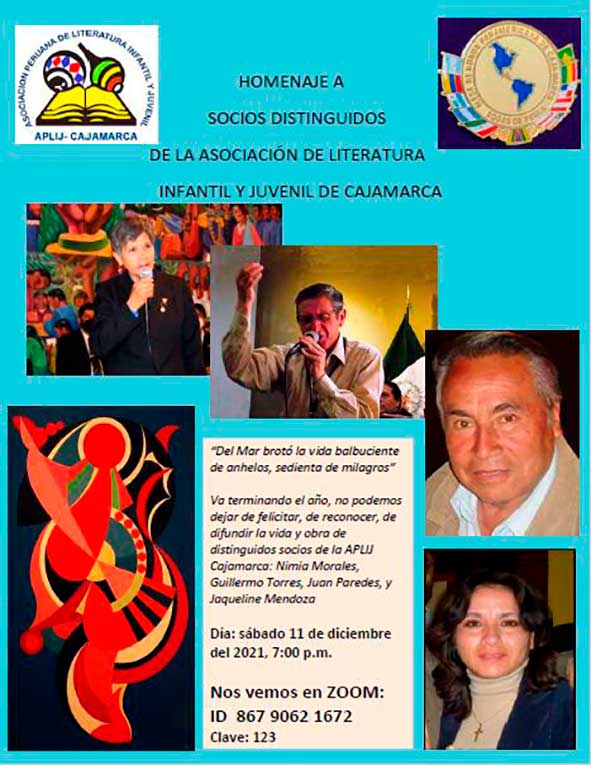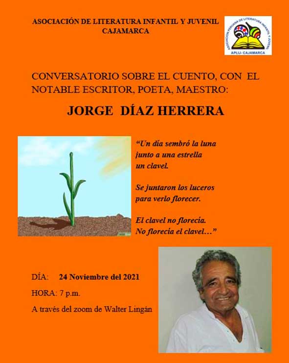 Estimados amigos y amigas, la APLIJ Cajamarca, los invita a compartir el conversatorio sobre El Cuento, que tendremos con el singular y notable escritor Jorge Diaz Herrera, el día 24 de noviembre del presente año, a partir de las 7 de la noche.