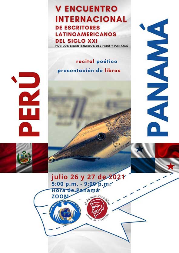 El sello cultural el duende gramático y el Circulo Universal de Embajadores de la Paz en Perú, invitan a ustedes en el marco de los bicentenarios de la Independencia del Perú y Panamá de España, al V Encuentro Internacional de Escritores Latinoamericanos en el siglo XXI Panamá-Perú, los días 26 y 27 de julio de 2021.