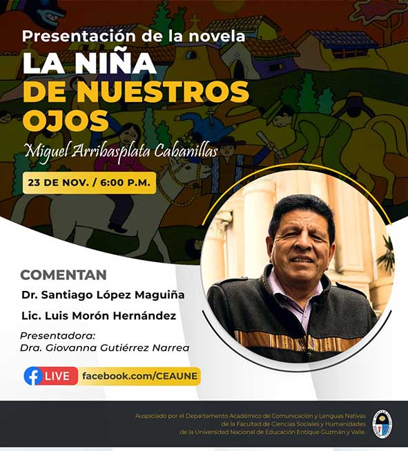El Departamento Académico de Comunicación y Lenguas Nativas invita a toda la comunidad cantuta a participar de la presentación de la novela LA NIÑA DE NUESTROS OJOS, obra realizada por el escritor Miguel Arribasplata Cabanillas, docente de nuestra casa de estudios.