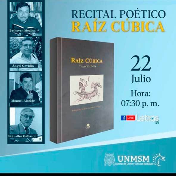 NUESTRO RECONOCIMIENTO A LA UNIVERSIDAD NACIONAL MAYOR DE SAN MARCOS A TRAVES DE LA FACULTAD DE LETRAS Y CIENCIAS HUMANAS Y AL POETA Y DR. GONZALO ESPINO RELUCÉ, POR LA INVITACIÓN AL RECITAL DE POESIA DEL GRUPO LITERARIO "RAÍZ CÚBICA", ESTE JUEVES 22 DE JULIO A HORAS 7.30 PM. INVITAMOS A TODOS LOS AMIGOS A ESTE RECITAL VIRTUAL.