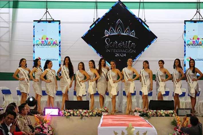SEÑORITA INTEGRACIÓN, MOTIVO DE CONFRATERNIDAD PARA LAS TRECE PROVINCIAS DE CAJAMARCA Las aspirantes al cetro demostraron su alto nivel de preparación en conferencia de prensa. El coliseo del emblemático colegio “Juan Ugaz” de la ciudad de Santa Cruz fue escenario de la presentación y conferencia de prensa de las aspirantes al título Señorita Integración 2024, certamen que organiza el Gobierno Regional de Cajamarca. Las trece representantes de la belleza, arte, cultura y tradición del departamento se presentaron ante autoridades, funcionarios y el público que abarrotó las instalaciones del plantel para ser partícipes de la gran fiesta del Rey Momo. “Es un honor contar con este hermoso ramillete de señoritas que son las embajadoras de nuestras provincias. El certamen Señorita Integración permite unir a nuestro departamento”, enfatizó el gobernador Roger Guevara Rodríguez. Las aspirantes al título Señorita Integración mostraron las bondades de su tierra, en artesanía, gastronomía y orfebrería, asimismo describieron rutas turísticas de su provincia. “Todas son ganadoras y esta experiencia es inolvidable, las felicito y estoy segura de su gran desempeño como embajadoras de sus provincias”, destacó la vicegobernadora Magda Farro Sánchez. Delegaciones de las trece provincias arribaron a Santa Cruz, tierra de la cordialidad que acoge a las soberanas en su etapa de preparación. La elección de Señorita Integración se realizará este 2 de febrero en la ciudad de Chota. Las soberanas son: •De Cajabamba, Gabriela Soledad Castillo León •De Cajamarca, Daniela Andrea Reano Díaz •De Celendín, Mailen Dolibeth Zelada Cotrina •De Contumazá, María de los Ángeles Marín León •De Cutervo, Laura Yomar Hoyos Toro •De Chota, Q'orianka Jeshua Sarely Núñez Olivera •De Hualgayoc, María Alejandra Burga Vásquez •De Jaén, Kathia del Pilar Álvarez González •De San Ignacio, Sandy Selena Lamadrid Adrianzen •De San Marcos, Camila Shantall Marín Aro •De San Miguel, Grace Solange Novoa Sánchez •De San Pablo, Mileydi Yudid Guevara Cabrera •De Santa Cruz, María Fernanda Pozada Calderón Fotografías de las candidatas: