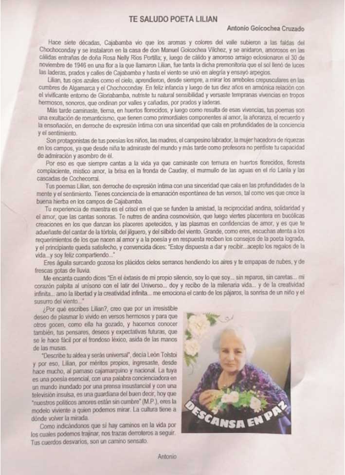Trabajos expuesto por escritores dirigidos a la poeta Lilian Goicochea: