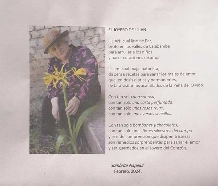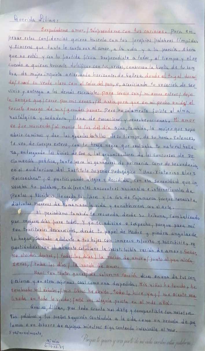 Las cartas y poemas de amor son joyas literarias que revelan los sentimientos más profundos de nuestros corazones, lamentablemente, esta hermosa virtud está desapareciendo; con el anhelo de preservar y cultivar este arte, inauguramos la XVII Muestra Internacional que quedará inmortalizada en un libro virtual. Esta XVII Muestra Internacional está dedicada a una poetisa cajamarquina que ahora goza de la Paz del Señor: Lilian Nelly Goicochea Ríos [Poeta del Ande]. Su legado romántico perdura en hermosos poemas que trascienden el tiempo, inmortalizados en sus libros. A través de esta muestra, honramos su memoria y celebramos la eternidad de sus palabras llenas de amor. / jcpa.