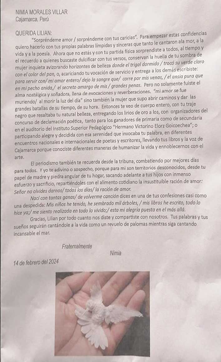 Lectura a la carta de la poeta Nimia Morales al poeta Lilian Goicochea a cargo de la poeta Sara Gutiérrez.