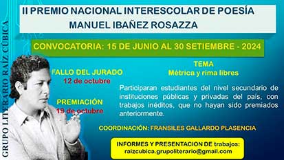 El Grupo Literario RAÍZ CÚBICA, fundado en Cajamarca en 1978, dando cumplimiento a sus objetivos de difundir la literatura peruana desde el interior del país, convoca al II Premio Nacional Interescolar de Poesía “Manuel Ibáñez Rosazza” 2024, para estudiantes de las Instituciones Educativas Públicas y Privadas. De esta manera, enaltecemos la labor de Manuel Ibá4 la generación 60;6 narrador, ensayista y exponente de la literatura 57 y juvenil en el Perú. Para el efecto, el Grupo Literario Raíz Cúbica nombra como Coordinador del Certamen al escritor Fransiles Gallardo Plasencia, y estableciendo las bases siguientes: BASES: