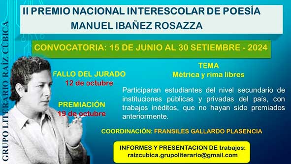 Bases del II Premio Nacional Interescolar de Poesía “Manuel Ibáñez Rosazza” 2024. Atención del Ing. Manuel Alcalde Palomino. [08/07/2024].