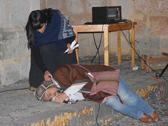 Los artistas cajamarquinos Luis Guerrero y xx escenificaron el cuento El caminante y la laguna Aurora incluido en el libro Chugur, tierra querida de William Guillén Padilla y Pepe Chávez Tejada. p. 142-143, e ilustrado por Renato Chávez Pajares.
