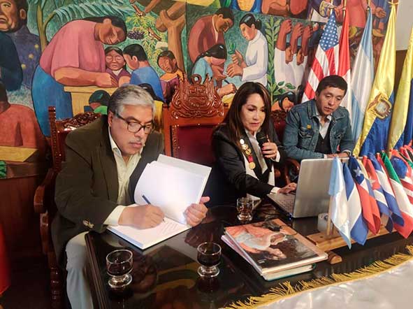 Vía Zoom, funcionarias de la Alianza, así como de las Asociaciones Nacionales de: Perú, Bolivia, Ecuador, Argentina, Chile, Colombia, Venezuela, Costa Rica, Honduras, Nicaragua y México, se hicieron presentes para hacer llegar su felicitación a la Mesa de Cajamarca, a su dinámica presidenta, por tan acertada idea de presentar a tan destacado exponente de la pintura, a quien le expresaron efusivas felicitaciones.