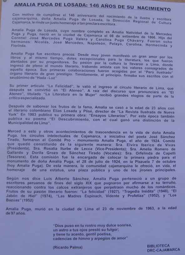 HOMENAJE A LA POETA CAJAMARQUINA AMALIA PUGA DE LOSADA, AL CONMEMORAR 146º ANIVERSARIO DE SU NACIMIENTO
