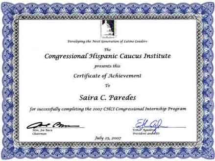 En el verano de 2007, es seleccionada junto a 33 estudiantes universitarios Hispanos, de sobresaliente rendimiento académico, como becaria al Capitolio de USA en Washington por el lapso de 03 meses, por la prestigiosa institución Congressional Hispanic Caucus Institute - 2007 Congressional Internship Program. Ver relación |