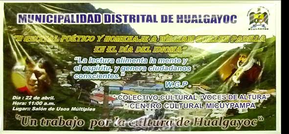 El día 22de abril del presente año, en el Auditorio de la Municipalidad Distrital de Hualgayoc se llevó a cabo el II Recital Poético y Homenaje William Guillén Padilla, connotado escritor hualgayoquino; evento organizado por el Centro Cultural Mucuypampa.