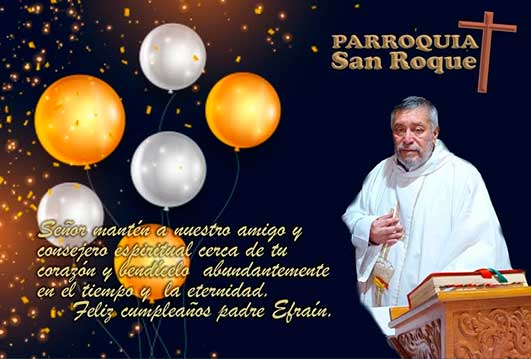FELIZ CUMPLEAÑOS PADRE EFRAÍN Querido Padre Efraín: En este día especial, damos gracias a Dios por el don de su vida y su vocación. Su entrega generosa, guía espiritual y cercanía con cada feligrés son un reflejo del amor de Cristo entre nosotros. Que el Señor lo colme de bendiciones, salud y alegría para que siga siendo luz y consuelo en nuestra comunidad. ¡Feliz cumpleaños, Padre, con todo nuestro cariño y oración!. Son los deseos, de la comunidad de la parroquia San Roque