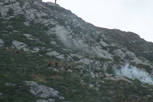 Aproximadamente a las cuatro de la tarde, un grupo de manifestantes lanzó avellanas hacia la zona donde se encontraba un contingente policial. Asimismo, se intentó derribar una línea de alta tensión que atravesaba la zona.
